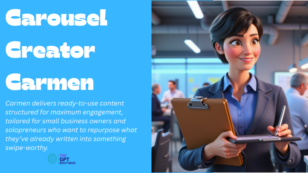 You’ll receive instant access to a private link to Carousel Creator Carmen—a Custom GPT trained to convert blog posts and longform content into engaging, platform-optimized carousels for LinkedIn and Instagram. No design tools or templates needed. Carmen delivers ready-to-use content structured for maximum engagement, tailored for small business owners and solopreneurs who want to repurpose what they’ve already written into something swipe-worthy.