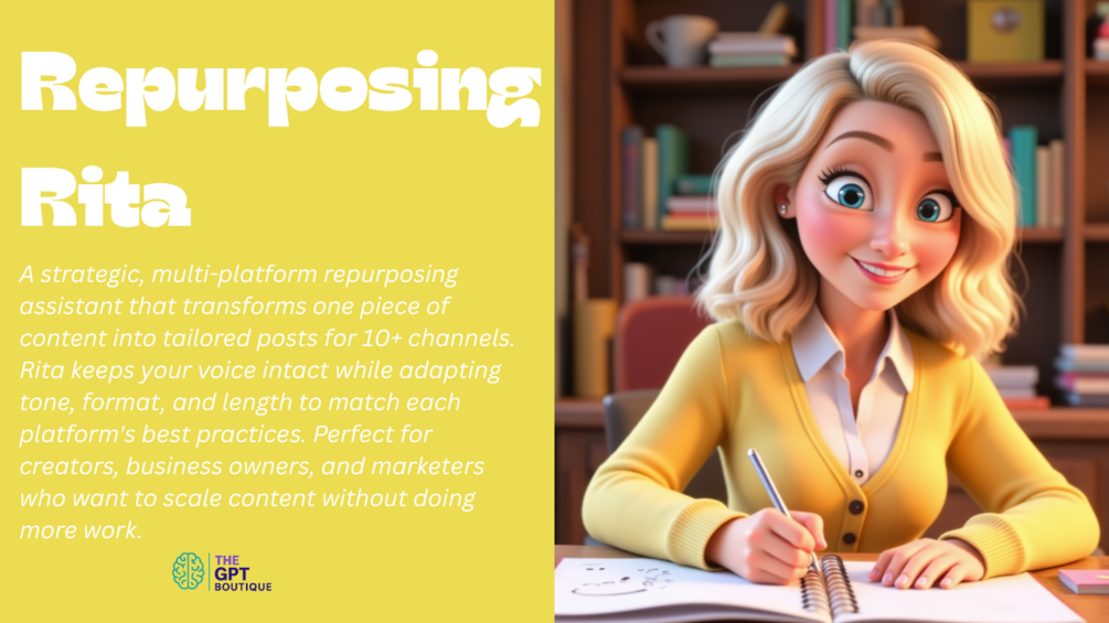 Rita isn’t your average AI. She’s trained to do one thing: repurpose content like a creative marketing team. Instead of reinventing the wheel daily, let her spin one idea into an entire content calendar. Save time, stay visible, and keep your message consistent without losing your voice.